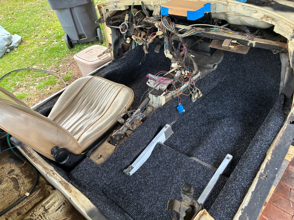 During one of those times, I went and cut new carpet for the interior, installed it, and installed the (repaired) driver’s seat.