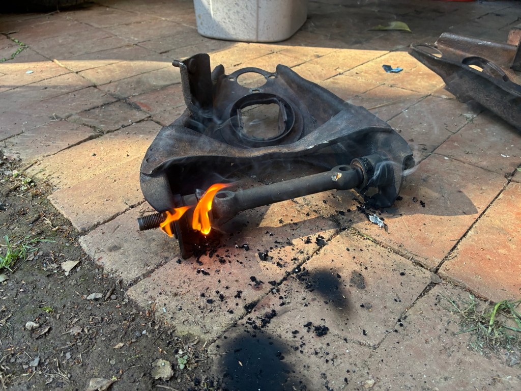 ALL the other time I’ve had has been devoted to the suspension. Let’s just say that some fire, penetrating oil, hammering, bending, pulling, clamping, more fire, more hammering – all of that needed to disassemble the upper and lower control arms, remove old ball joints, and remove old bushings.