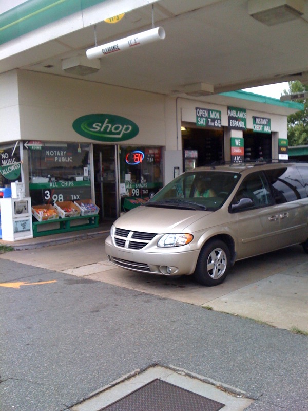 I will take a photo of Everett’s soon and add it to this post. (updated – >) Hand-painted signs that ask customers to NOT have their radios on adorn the building. Chickens are kept in a fenced in area out back, that has a swingset and sandbox nearby, just in case your kids need a break. There is an open garage area in the back, complete with jacks, stands and air guns – IF you want to do some work yourself. Free. Just use it and take care of it.