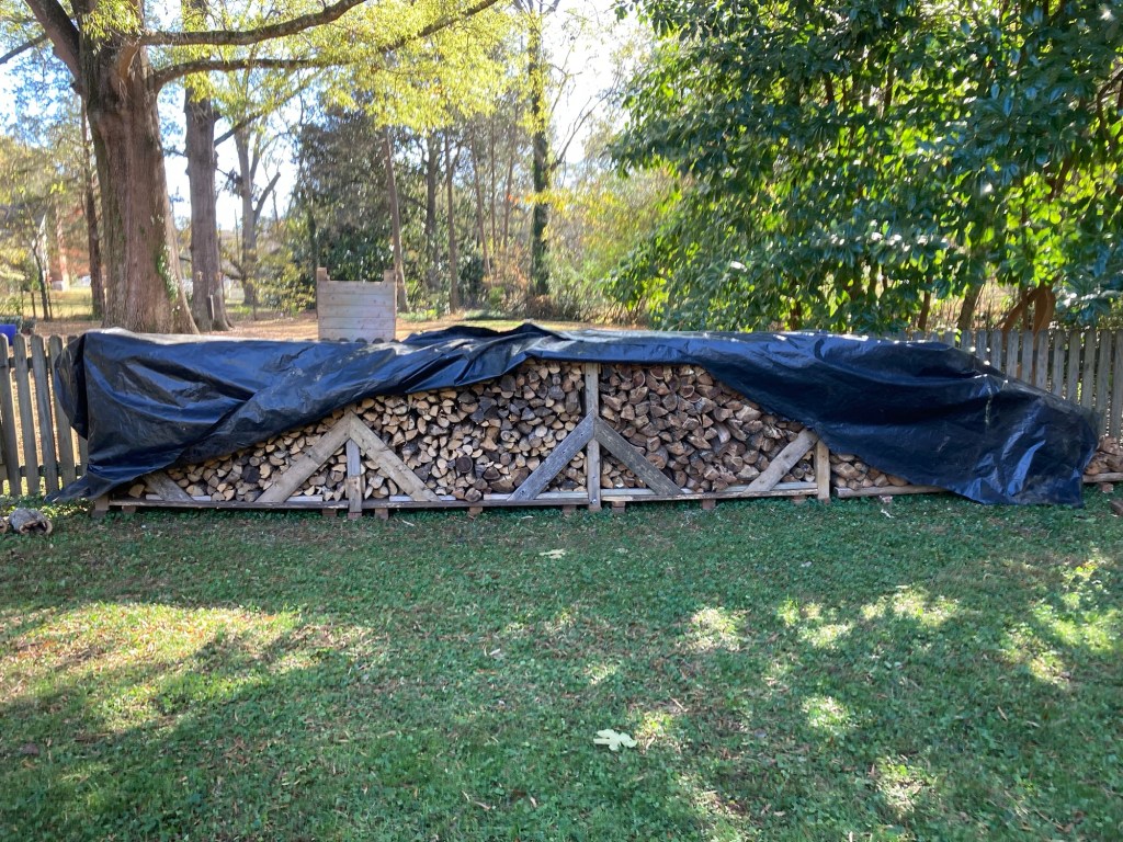 First I had to build a firewood stand. My neighbors’ kids’ play structure was obliterated in one of the first storms of the season (walnut tree fell on it) and he gladly let me pick from the remains to make this. And then, we lift haul and stack…