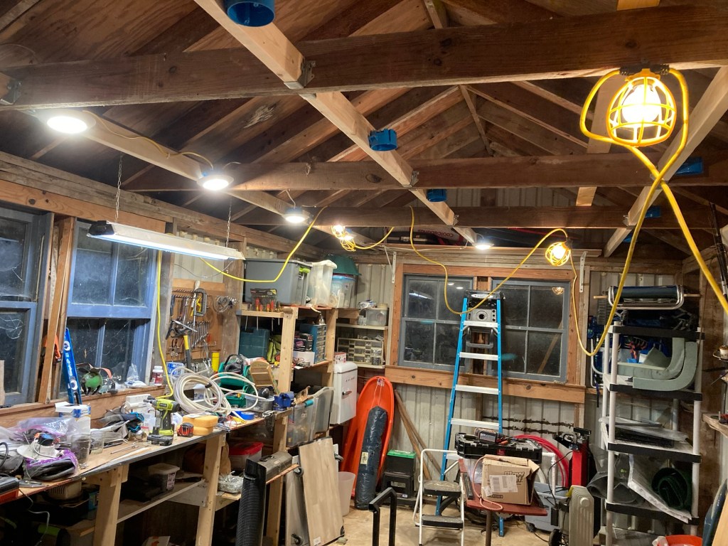 Thanks to a gift from Robert C, I had 16 LED lights and, with help from Eric M we got them wired to the switch. Showing a couple of photos to show the progress: