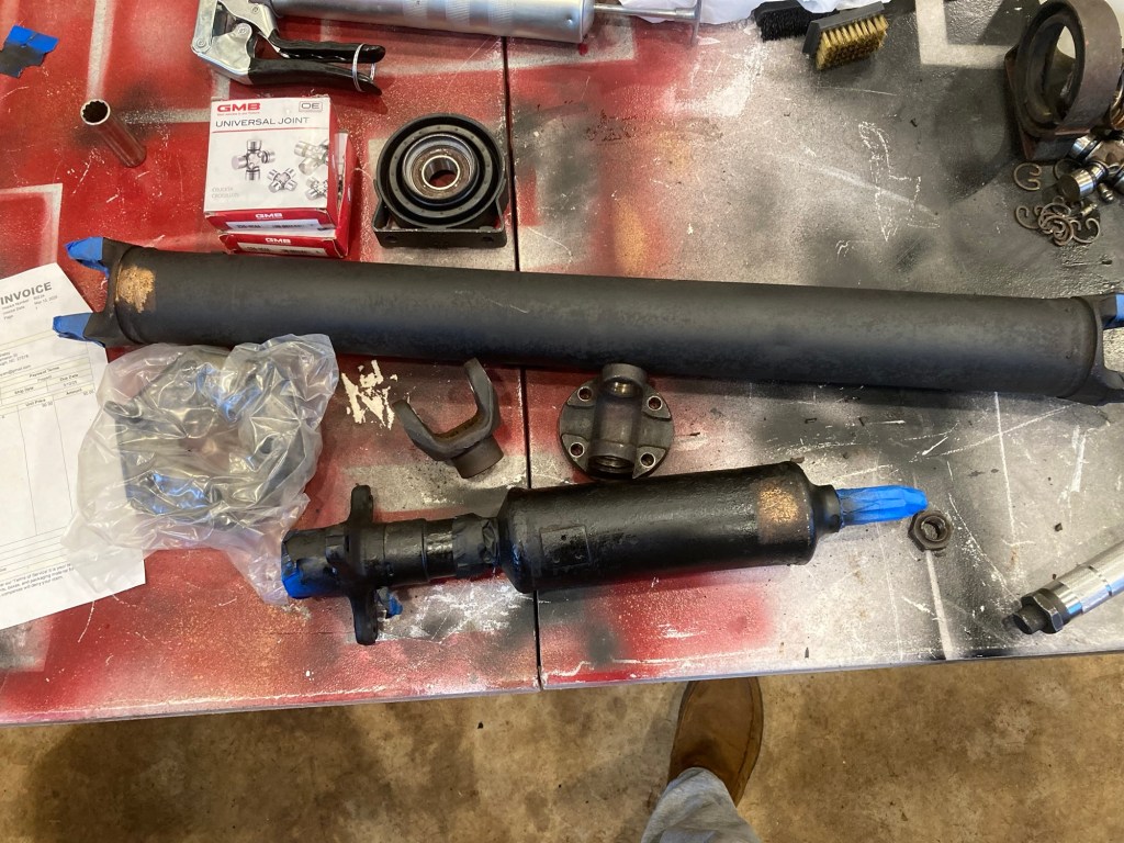 Now I have all the new parts to reconnect the shaft – and have sprayed them with rust killer. Notice the gold spots – those are there to guide reassembly as the shaft parts are balanced to each other and need to be connected in that way.