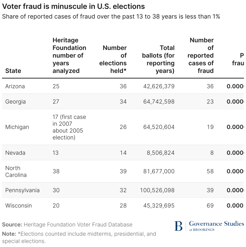 4. The Heritage Foundation’s own work (omg please. I hope I never quote them again). The Brookings Institute did a review of the Heritage Foundation’s tracking of supposed voter fraud in the U.S. The following tells the whole story – that they had to go back more than 30 (THIRTY) years looking at all state and federal elections to come up with a number that people are now using in their arguments.